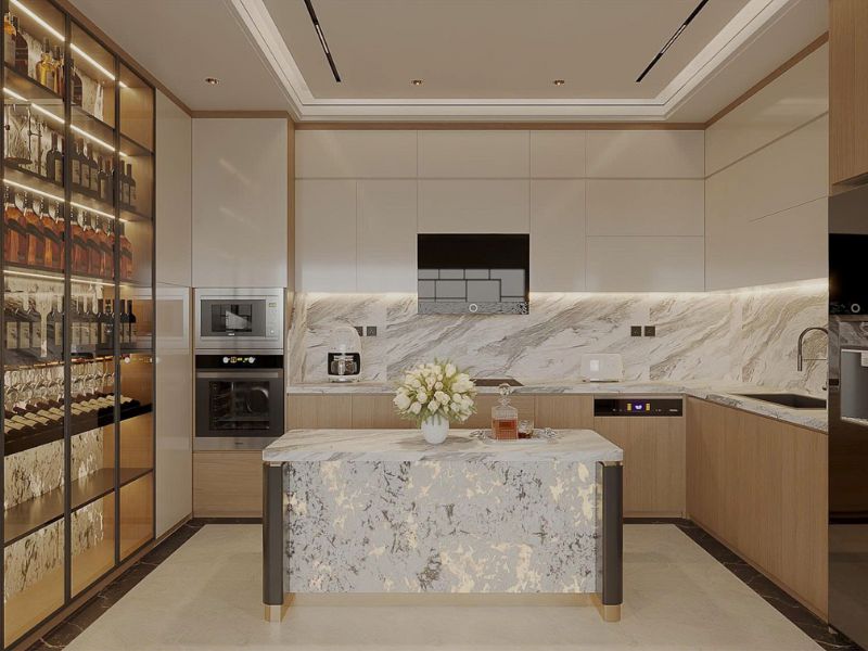 Phong cách luxury luôn mang đến sự xa hoa, đẳng cấp cho ngôi nhà với các chi tiết tinh xảo và vật liệu cao cấp. Bếp được thiết kế theo phong cách này thường có điểm nhấn nằm chất liệu đá vân mây, gỗ óc chó, tay nắm inox mạ vàng, hệ tủ Blum hoặc Hafele và thiết bị bếp cao cấp: bếp từ âm, máy rửa chén, hút mùi âm trần.